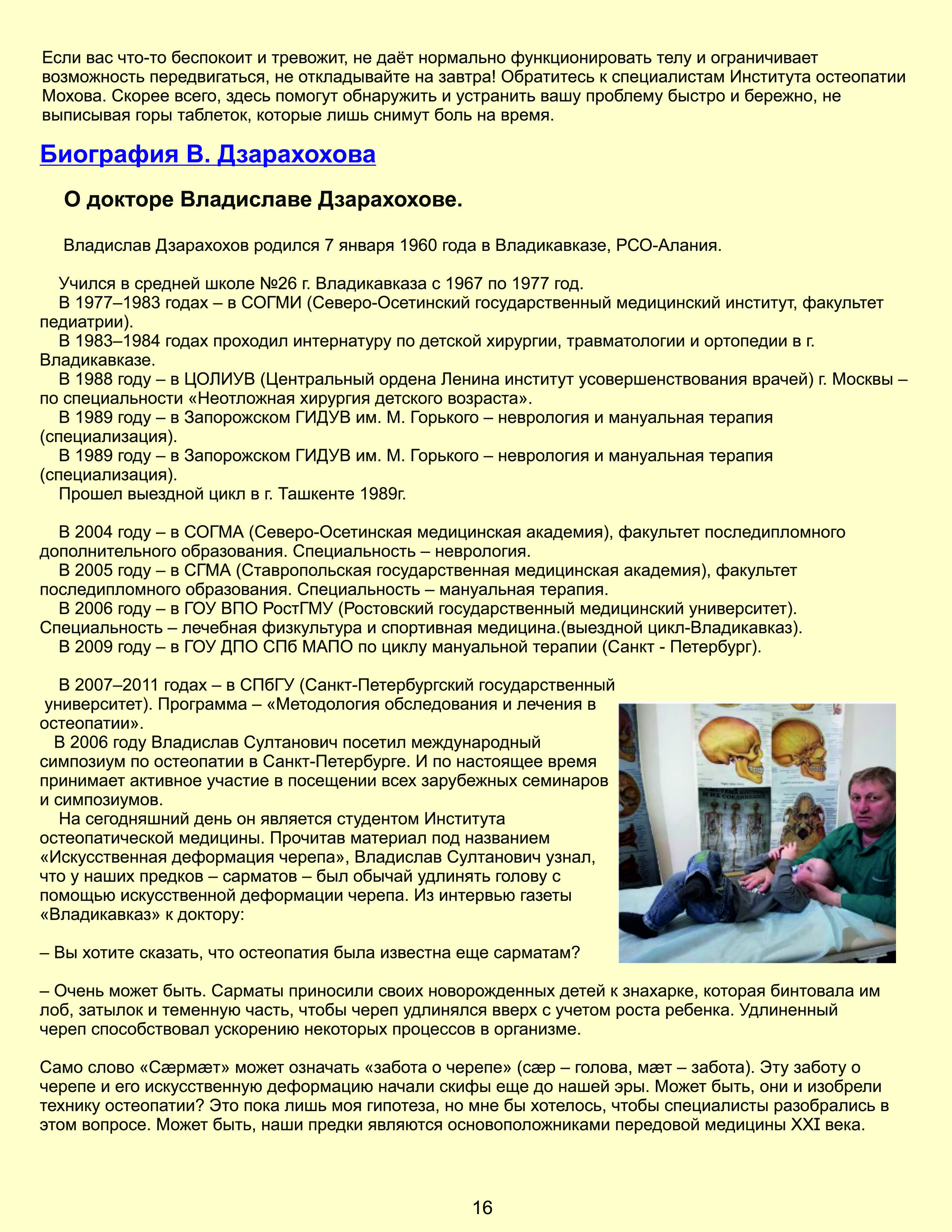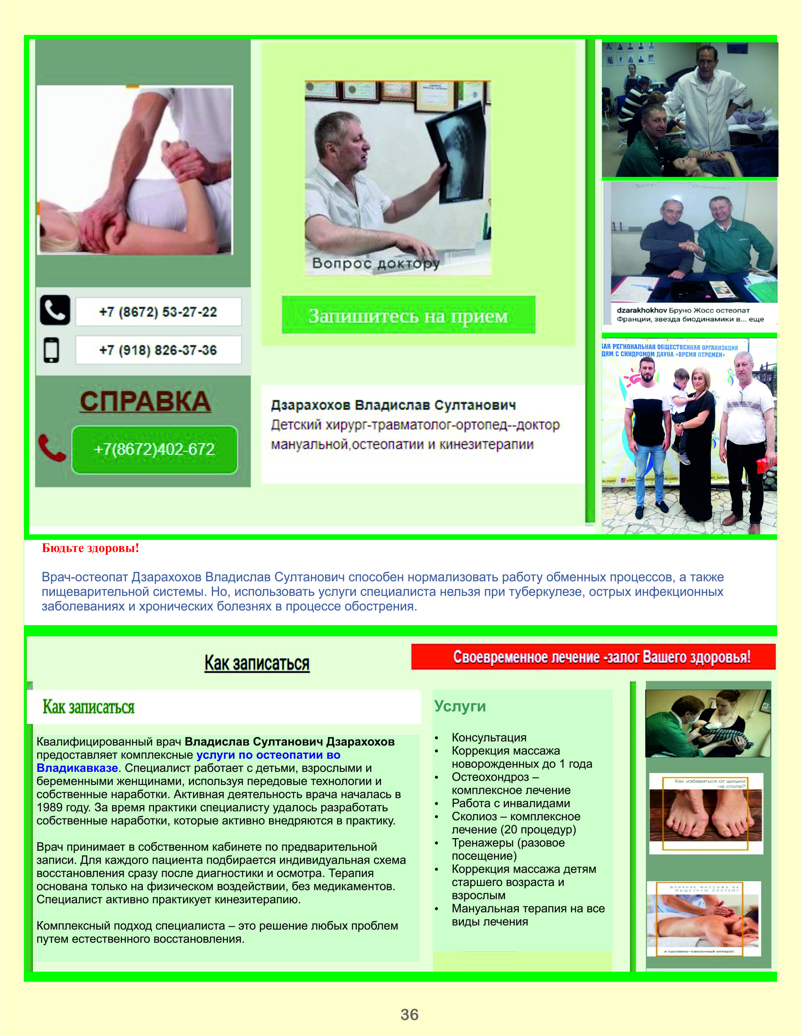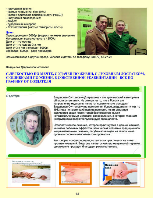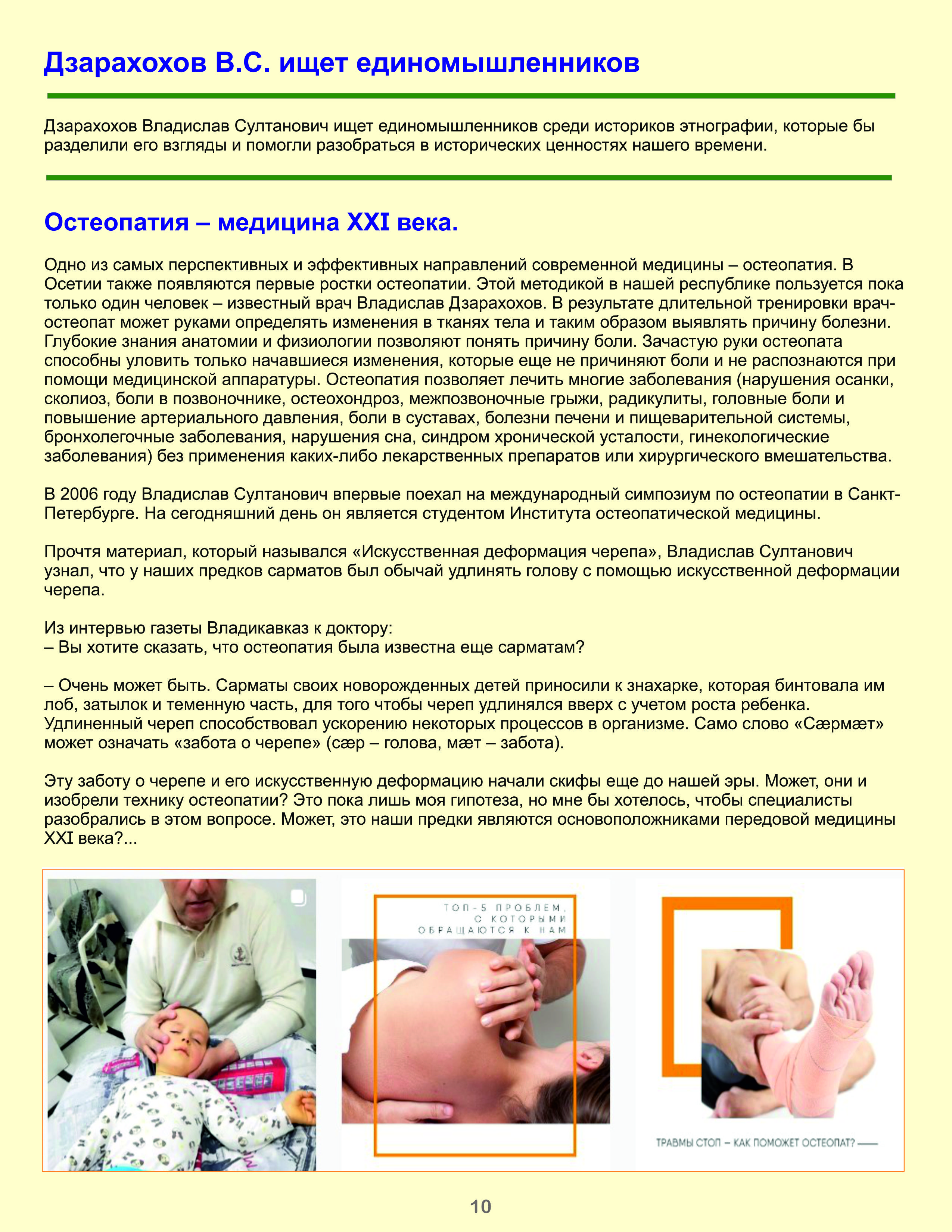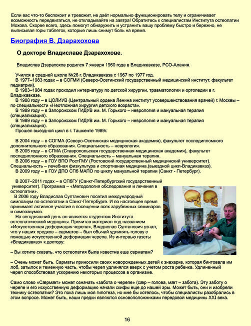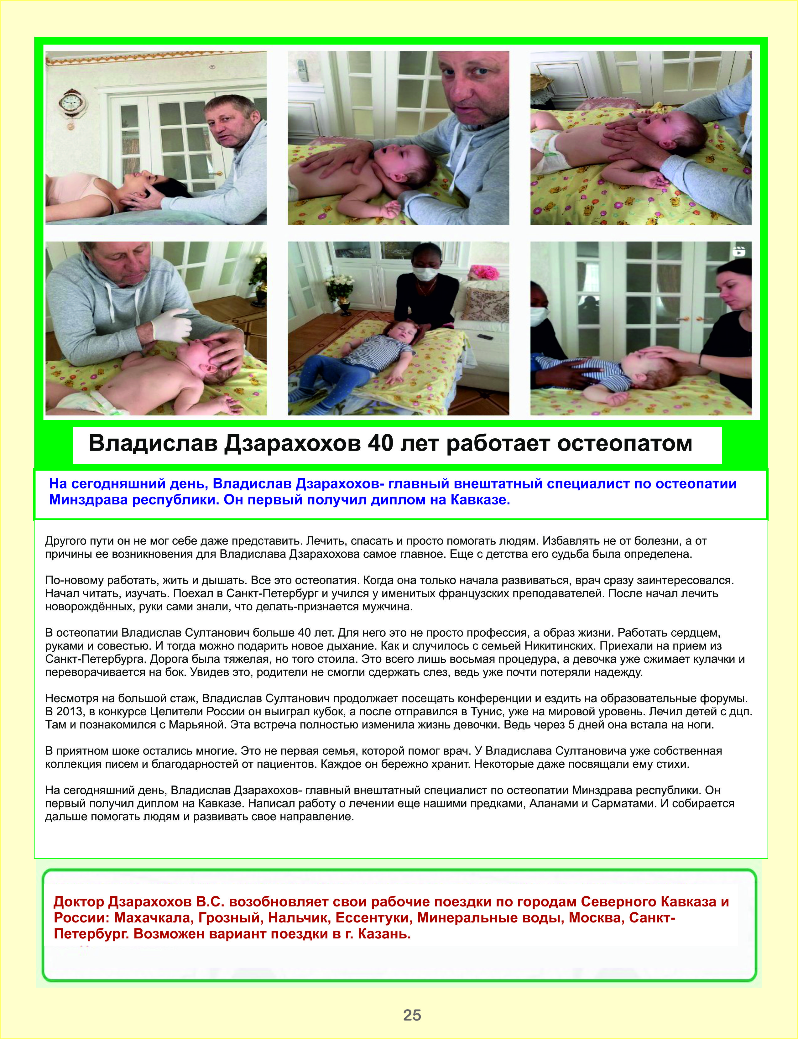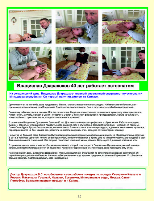 На сегодняшний день, Владислав Дзарахохов- главный внештатный специалист по остеопатии Минздрава республики. Он первый получил диплом на Кавказе. Написал работу о лечении еще нашими предками, Аланами и Сарматами. И собирается дальше помогать людям и развивать свое направление.