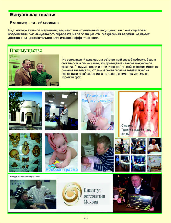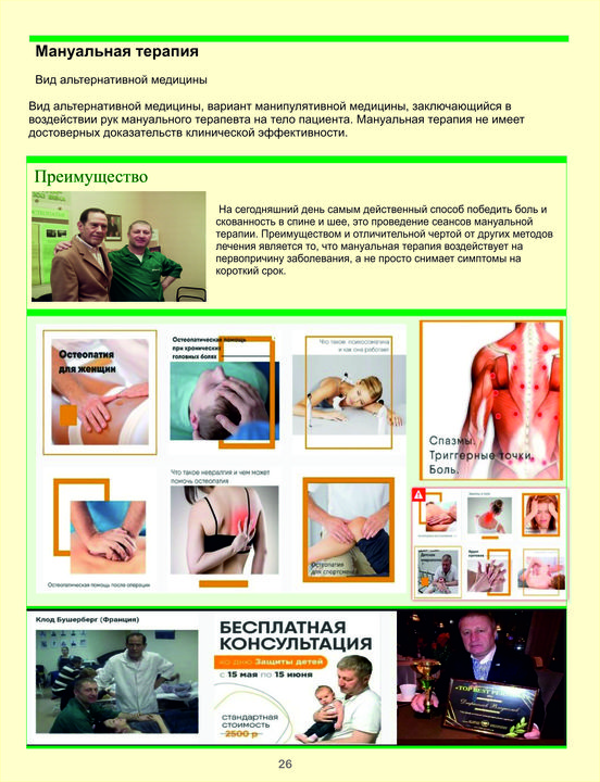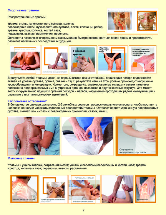 Прежде всего, следует заметить, что остеопатия не является синонимом мануальной терапии, а лишь ее подтипом. Мануальная терапия включает в себя также хиропрактику, частично — эрготерапию, физическую терапию, то есть все виды прямых воздействий рук терапевта на тело пациента. К мануальным терапевтам относятся также любители-костоправы. Поэтому, если в медицинском центре, который вы посещаете, есть кабинет мануальной терапии, то лучше уточнить, с каким конкретно специалистом вы имеете дело.
