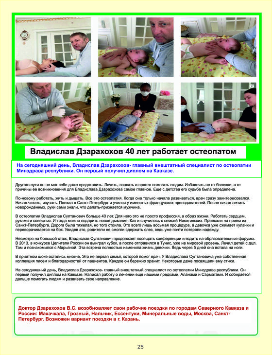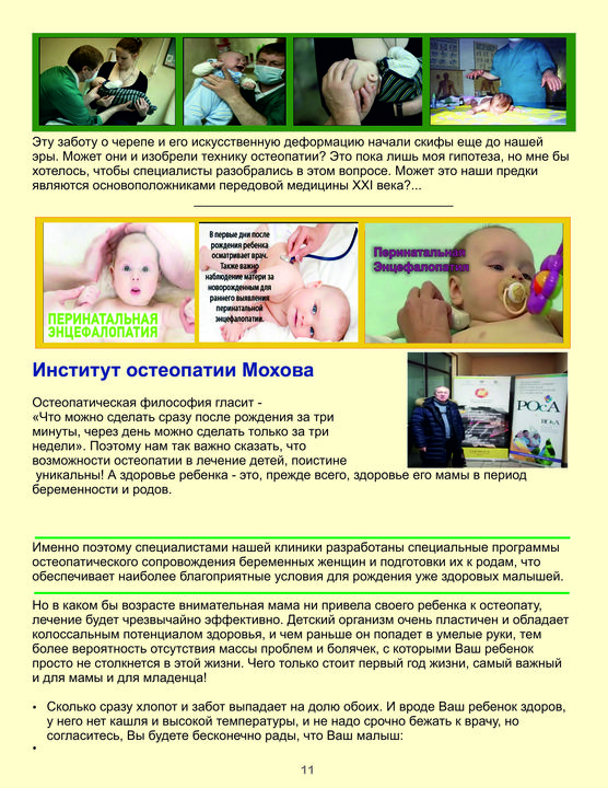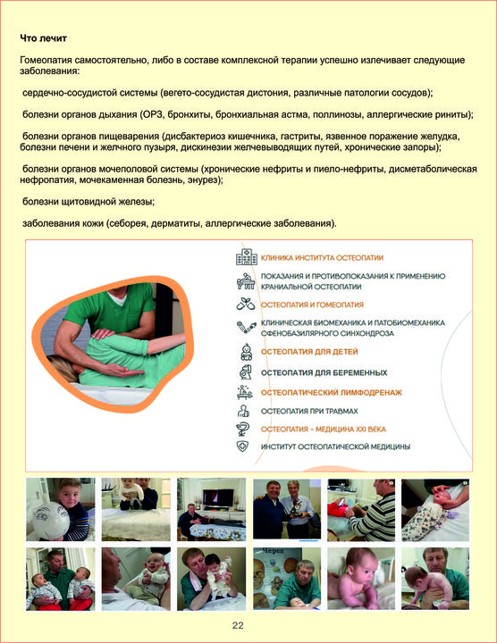 Остеопатия - это направление в медицине, где диагностика и лечение осуществляется руками врача. Цель остеопатического лечения - восстановление равновесия человеческого тела, активизация защитных сил организма, иммунитета, повышения уровня адаптации, восстановления человеческой механики со всеми ее составляющими. Краниальная остеопатия - метод ручного воздействия на мозговой и лицевой череп с целью нормализации ликвородинамики, устранение нарушений венозного оттока и артериального кровоснабжения головного мозга, последствий черепно-мозговых травм. Более 70 детей в год рождается с травмами черепа и позвоночника. Помочь им в этом случае могут руки остеопата: достаточно иногда освободить кости черепа и крестец, чтобы вернуть ребенку право на нормальную жизнь, образование и будущее.